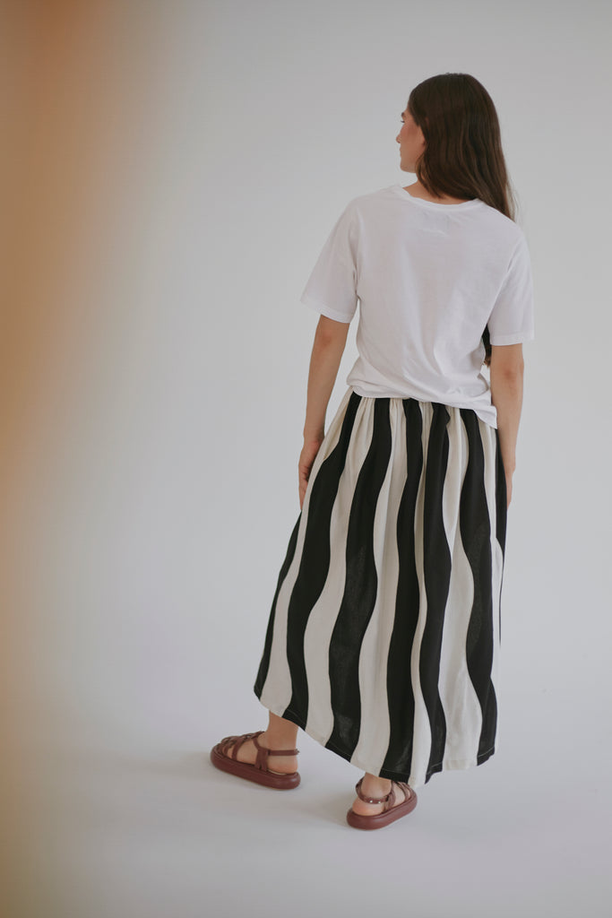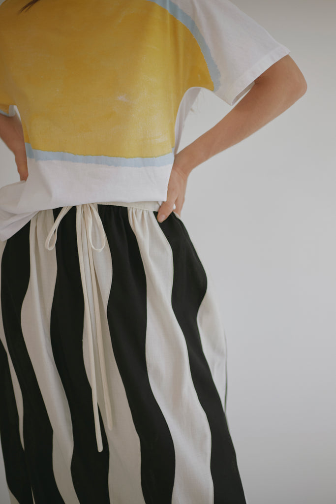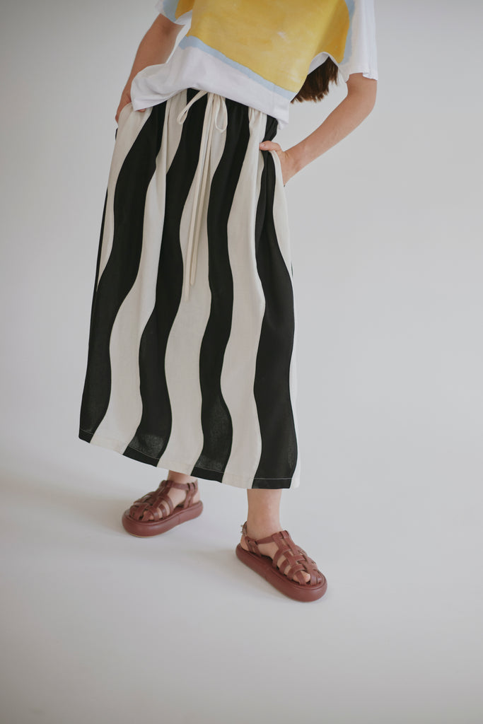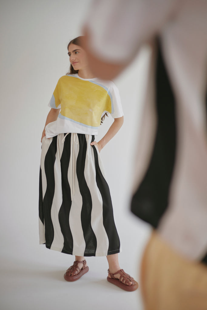 Después de nuestra falda anomalía quedamos enamorados de las faldas amplias y midi así que en la placita creamos una versión mas relajada, divertida y versátil, su cintura fruncida es ajustable gracias al lazo y tiene elástico en el posterior.